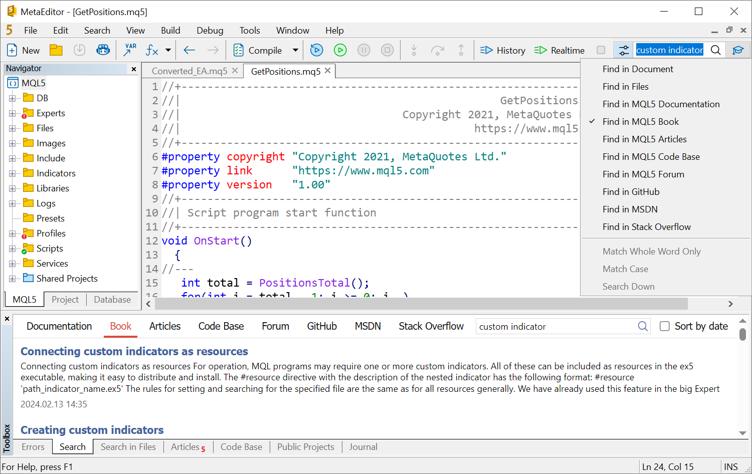 1. 在帮助\MQL5.community菜单中添加最近发布的书籍“MQL5交易者编程”的链接。该书也已添加到搜索系统,因此您可以直接从MetaEditor找到所需的信息: