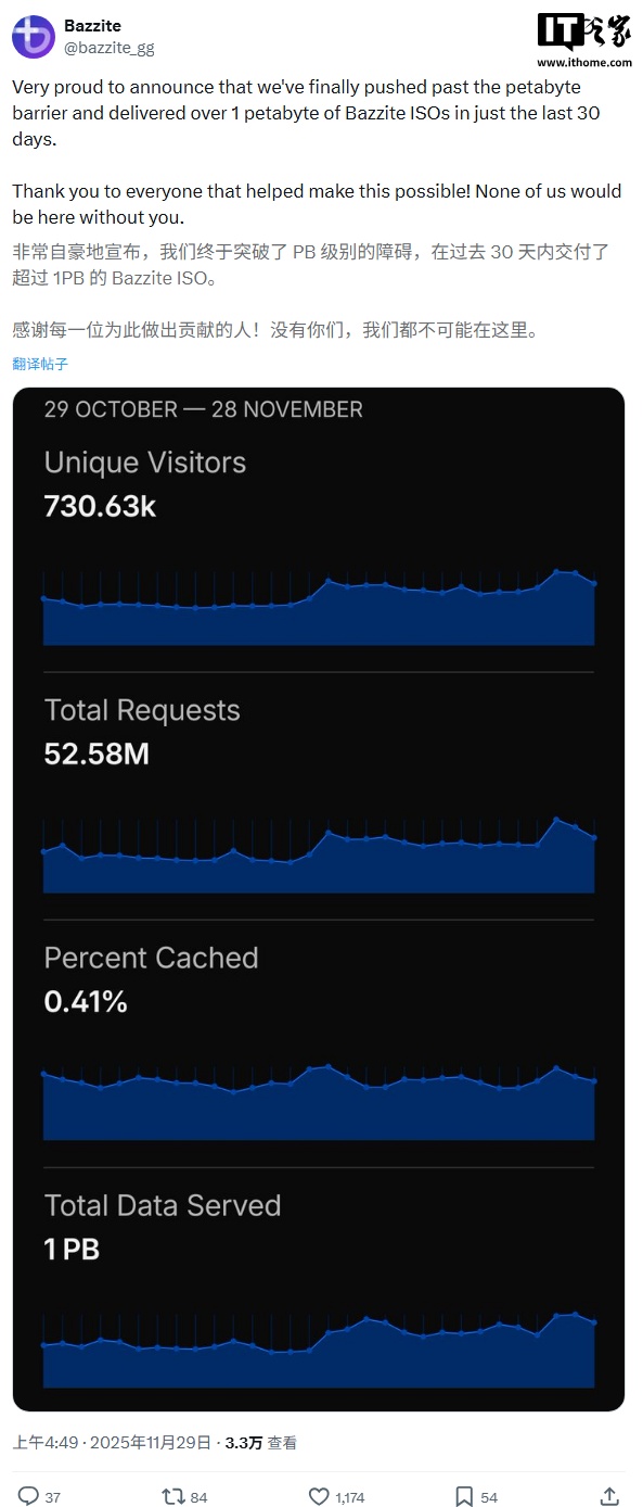 根据 Bazzite 团队公布的信息,从 10 月 29 日到 11 月 28 日,该项目网站获得 73 万独立访问者,并首次在单月内传输 1PB 数据。