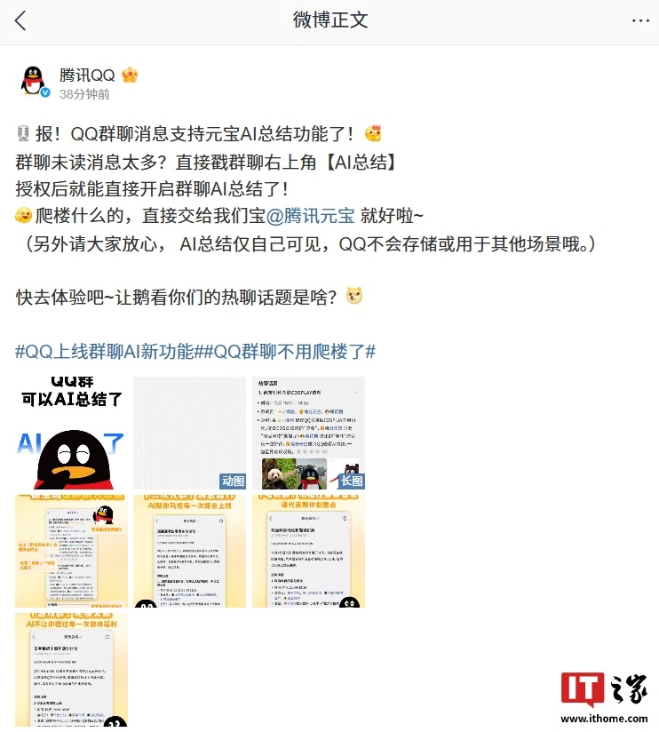 12 月 11 日消息,腾讯 QQ 官方微博今日宣布,QQ 群聊消息支持元宝 AI 总结功能,如遇群聊未读消息太多,可直接点击群聊右上角【AI 总结】,授权后就能直接开启群聊 AI 总结。